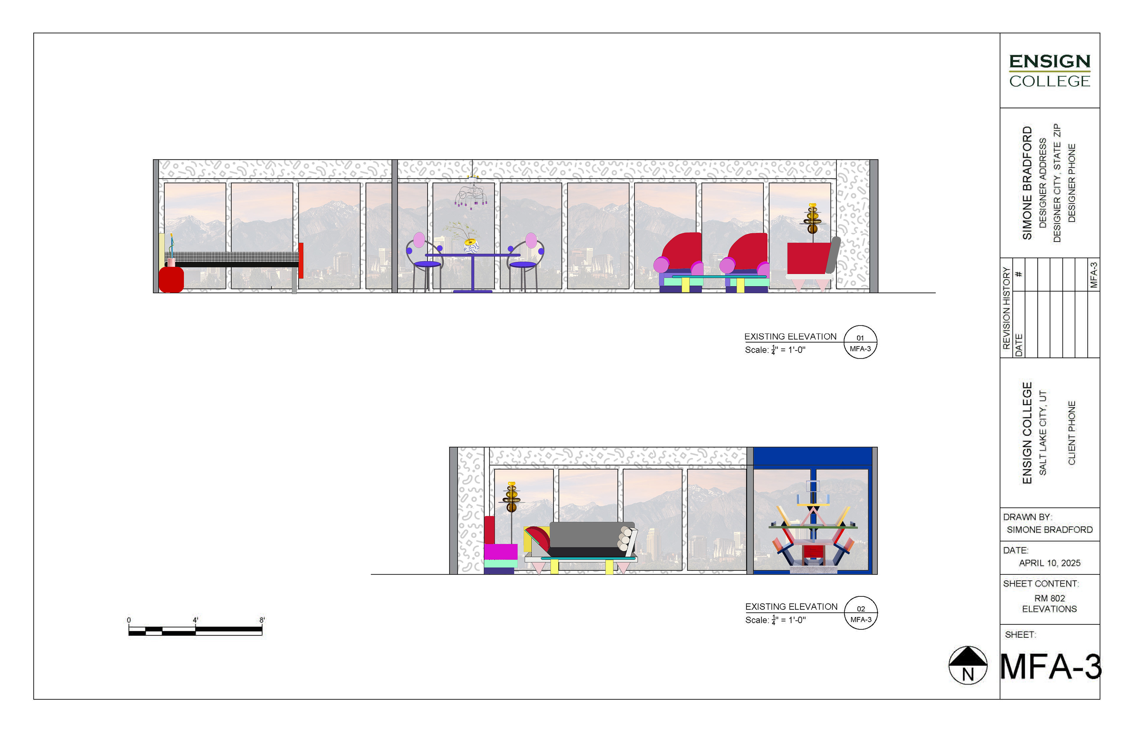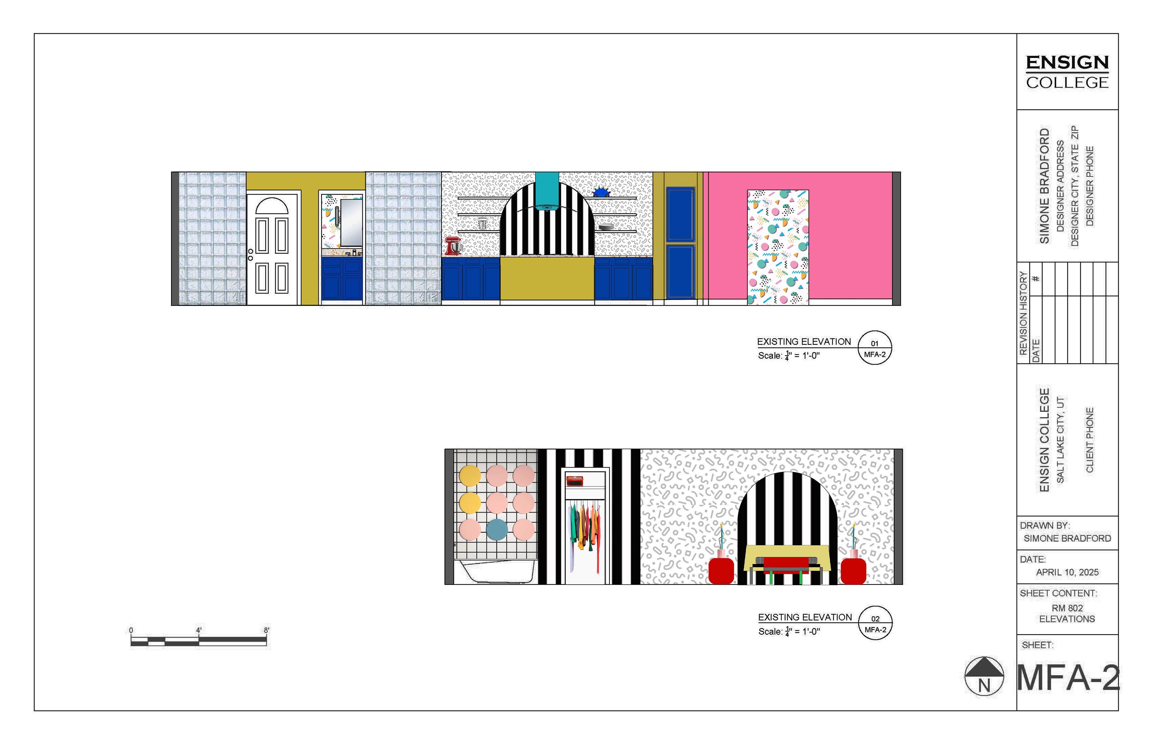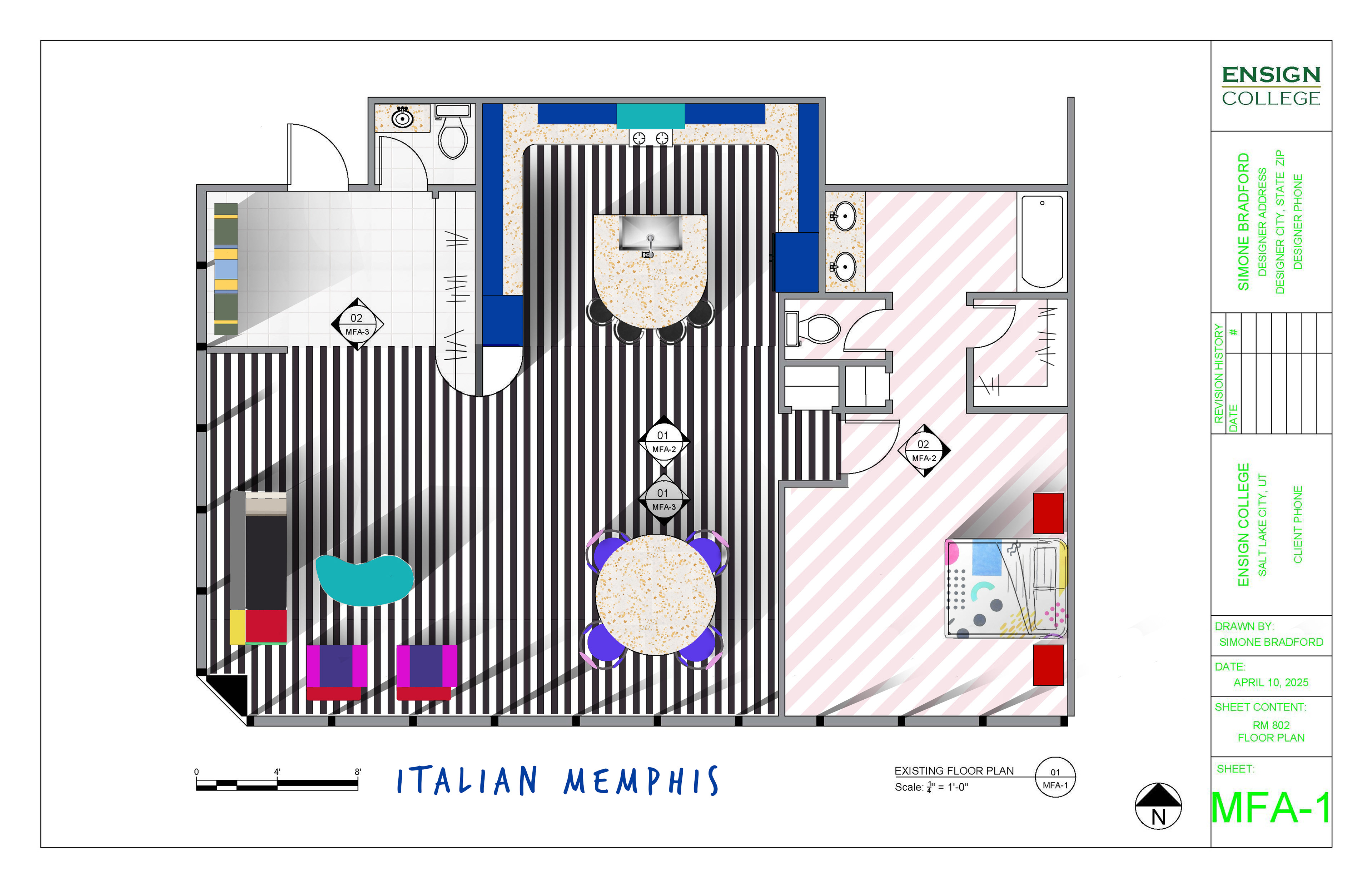 Redesigned a commercial space into a residential apartment inspired by the 1980s Italian Memphis style. Space planning guided the kitchen and bathroom layouts. Floor plans and elevations were created in AutoCAD, with renderings and custom furniture graphics produced in Photoshop. Completed in Winter term 2025