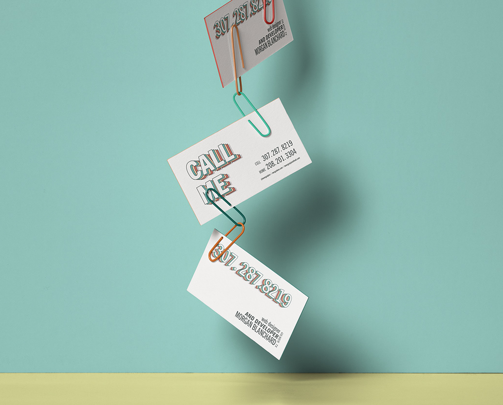 In 2021, Morgan Blanchard created a personal business card that demonstrated a kitschy overuse of drop shadows and negative space to create a streamlined and simple design, emphasizing the phone number and "Call Me" tagline. She used scale to create typographical hierarchy and a focal point.