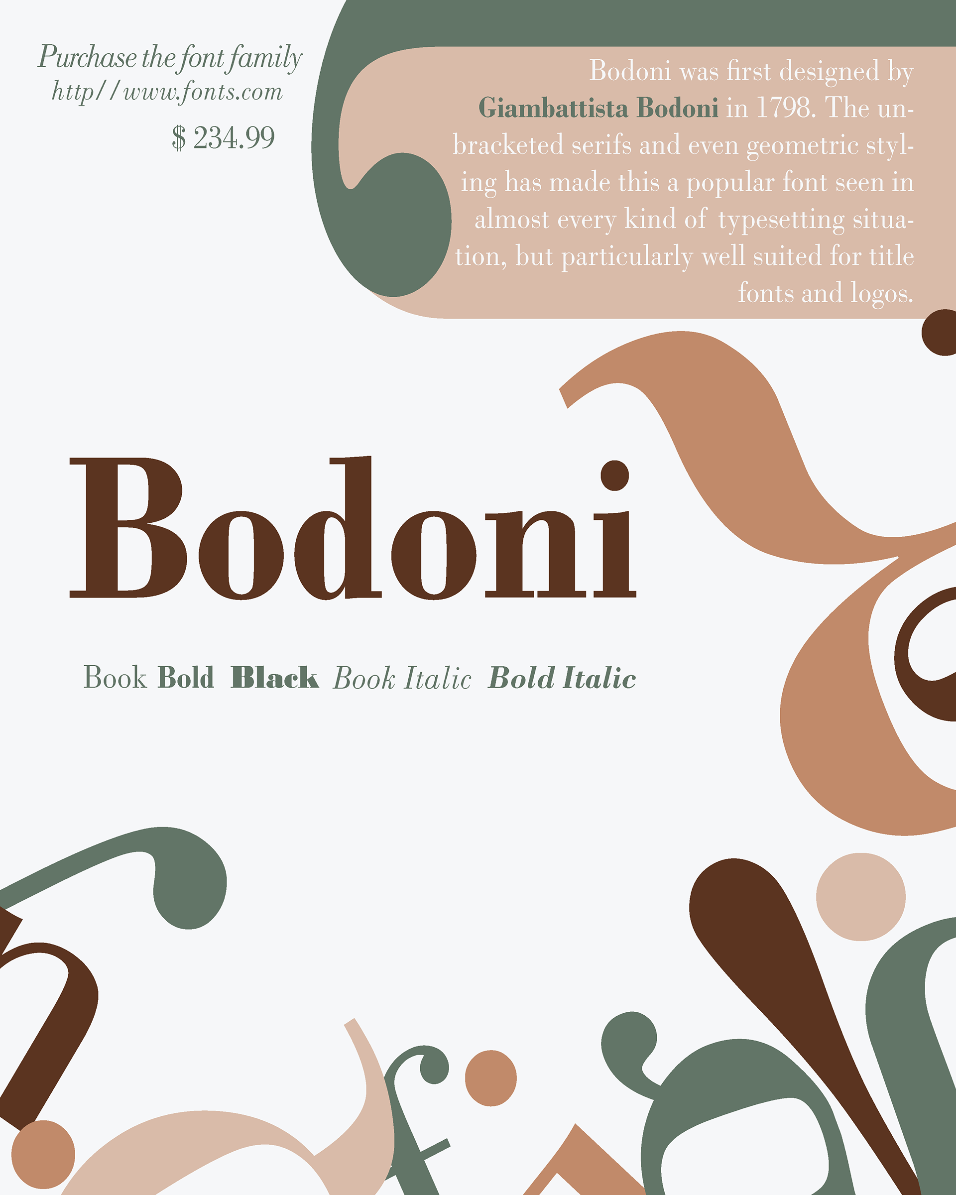 Victoria Jensen, a graphic design student, created this poster to highlight the unique characteristics of the Bodoni typeface, skillfully utilizing negative space to enhance its visual impact. Completed for ART 230.