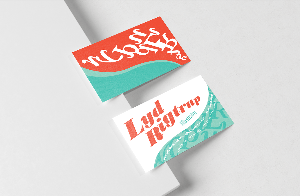 In 2024, graphic design student Lyd Rigtrup challenged traditional design conventions by creating a personal business card featuring expressive curved typography. She used color and scale to establish a clear visual hierarchy between her name, title, and contact information, which was further organized through the strategic use of bold and regular type weights.