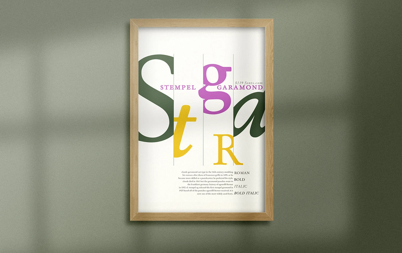 In 2022, student Karen Harris designed this font poster to highlight the defining characteristics of Stempel Garamond. Using the 'Lost and Found' design principle, she created visual interest through overscaled glyphs as a focal point and established structure with vertical dividing lines.